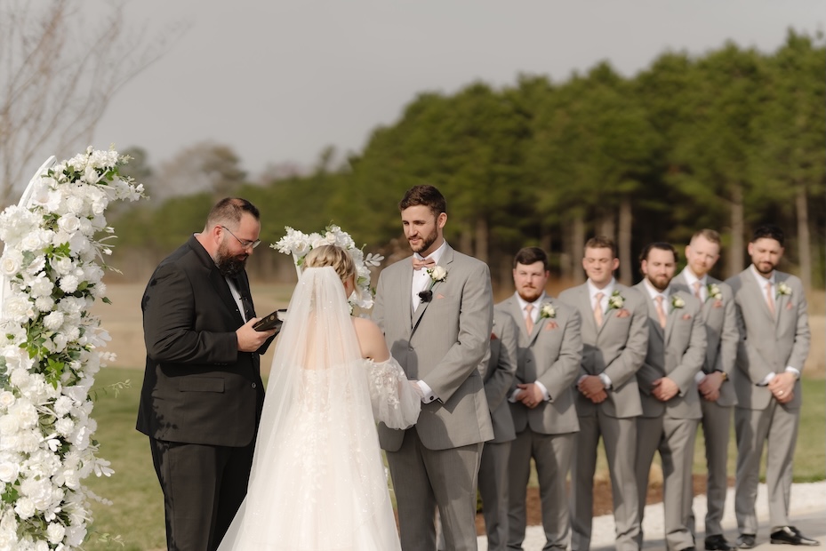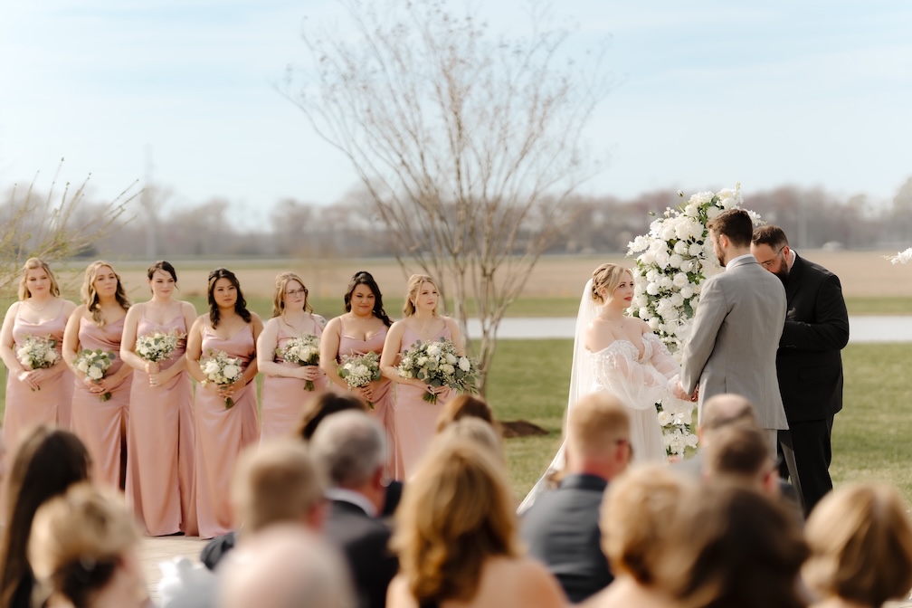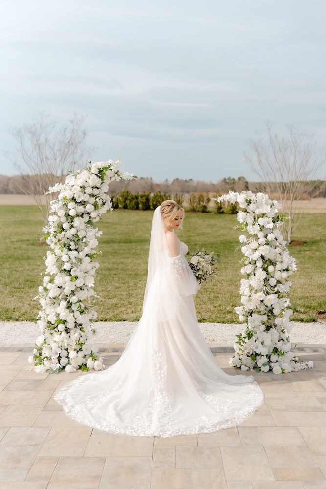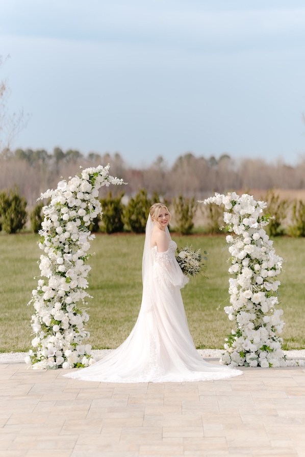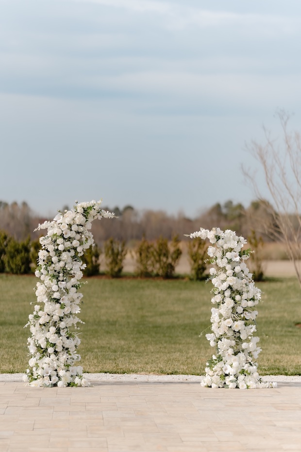 For the ceremony, we designed two lush floral pillars overflowing with white blooms and layered greenery. Positioned to frame Courtney and Kyle as they exchanged vows, the pillars created a striking focal point while still feeling organic and natural within the outdoor setting.