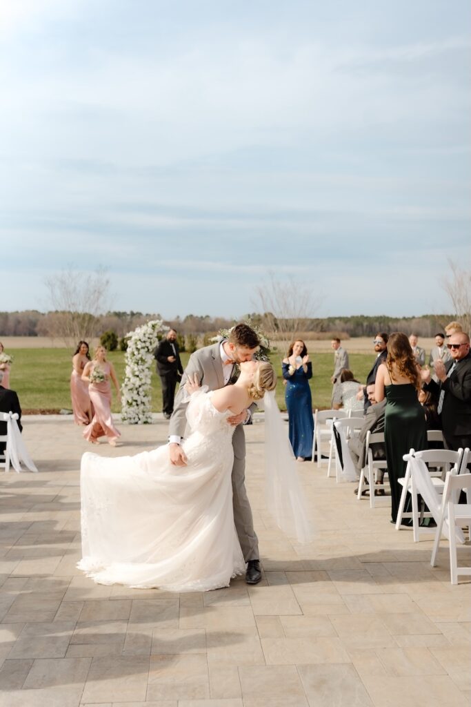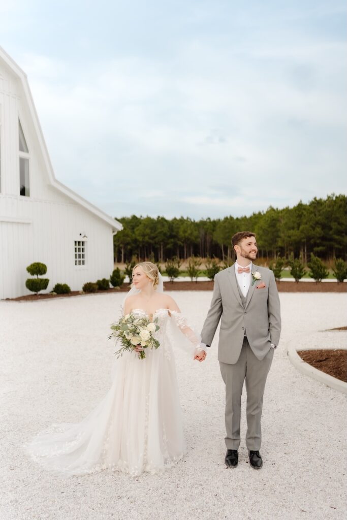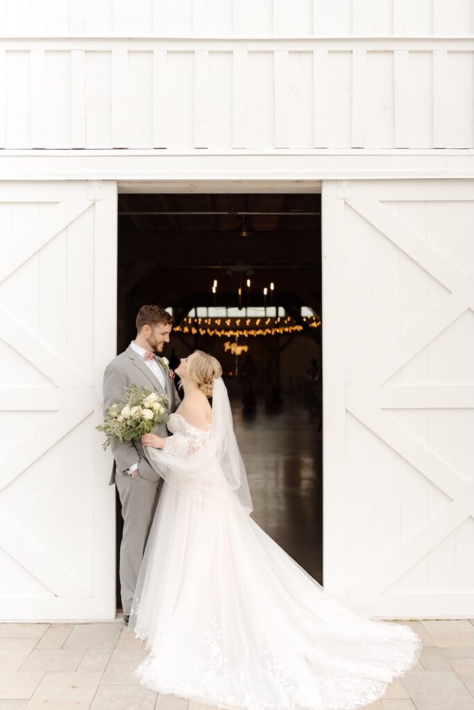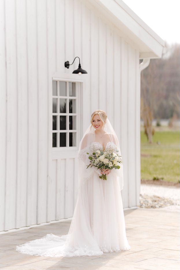 Courtney and Kyle’s wedding at Breckenridge Barn was the perfect example of timeless elegance. Set against the venue’s crisp white exterior, warm wood interiors, and expansive Eastern Shore landscape, their day embraced a classic green and white floral design that felt refined, romantic, and effortless.