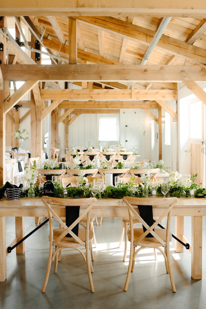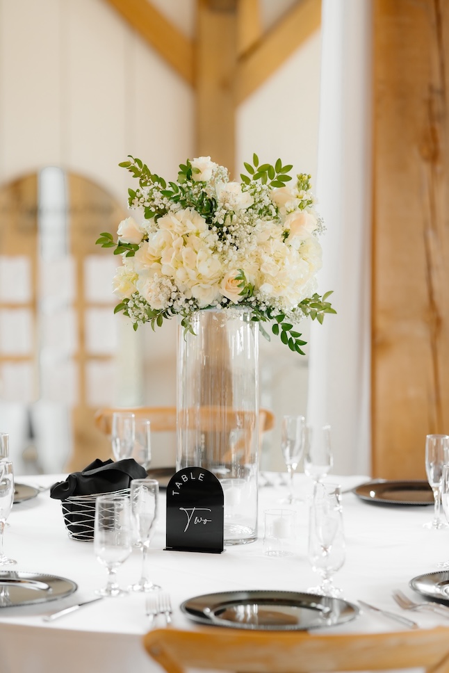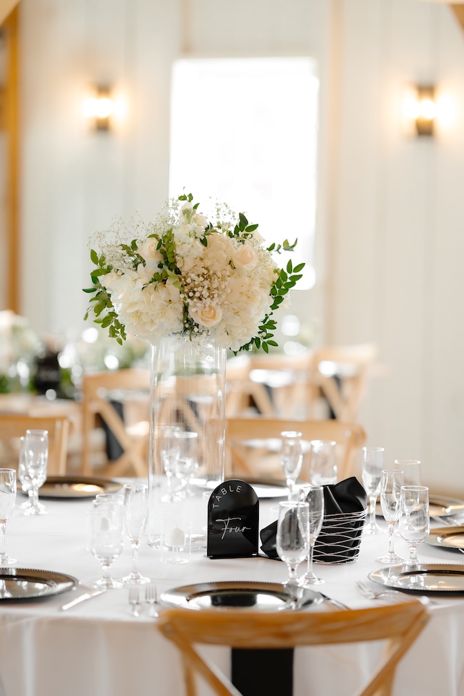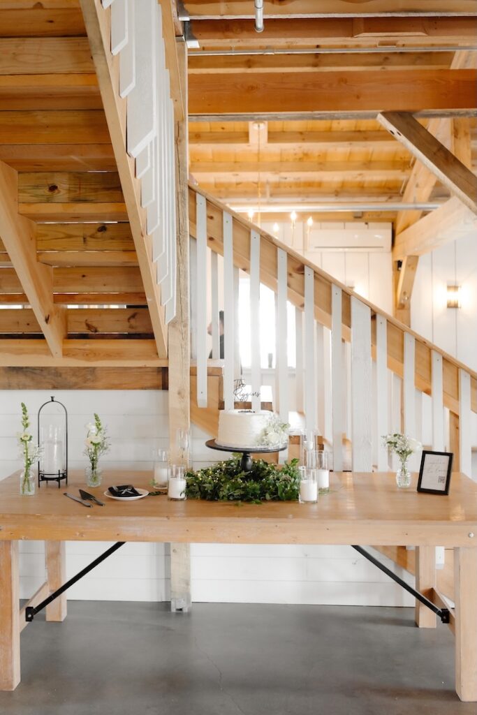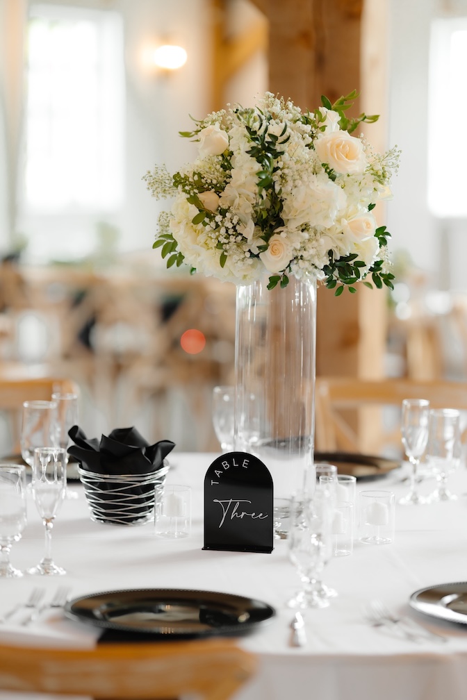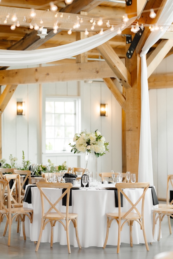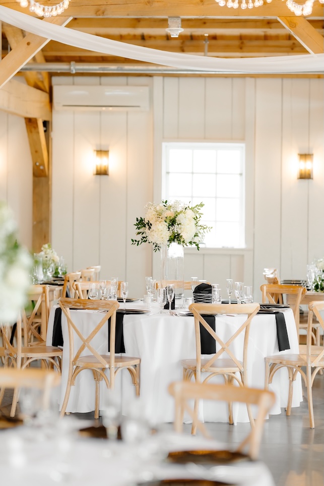Reception tables were styled with low, classic centerpieces (change to: stunning elevated centerpieces that sat atop timeless glass cylinders) featuring white blooms and greenery, complementing the barn’s warm wood tones and soft lighting. The florals added just the right amount of softness while keeping the tables inviting and uncluttered (with a clear sightline).