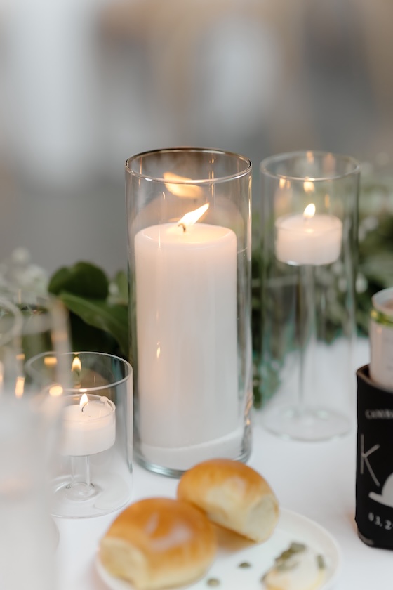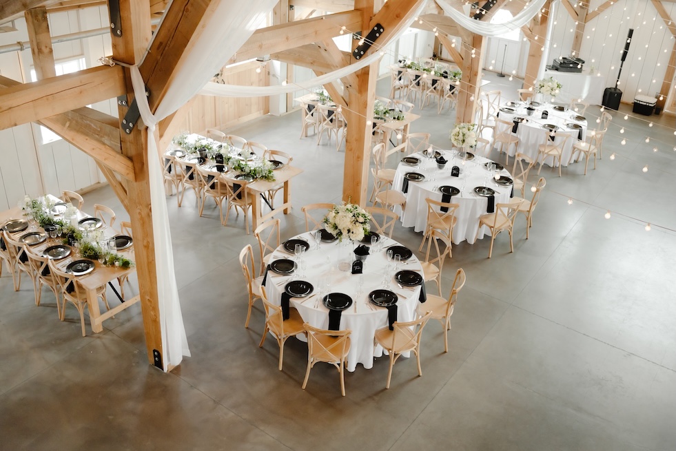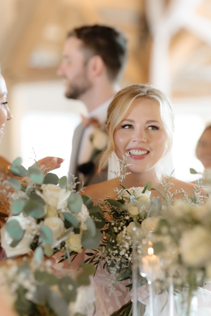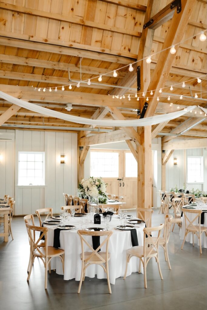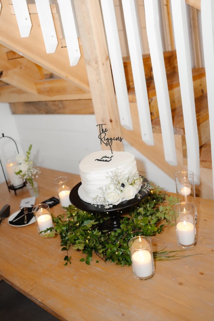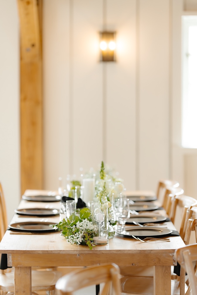 Reception tables were styled with low, classic centerpieces (change to: stunning elevated centerpieces that sat atop timeless glass cylinders) featuring white blooms and greenery, complementing the barn’s warm wood tones and soft lighting. The florals added just the right amount of softness while keeping the tables inviting and uncluttered (with a clear sightline).