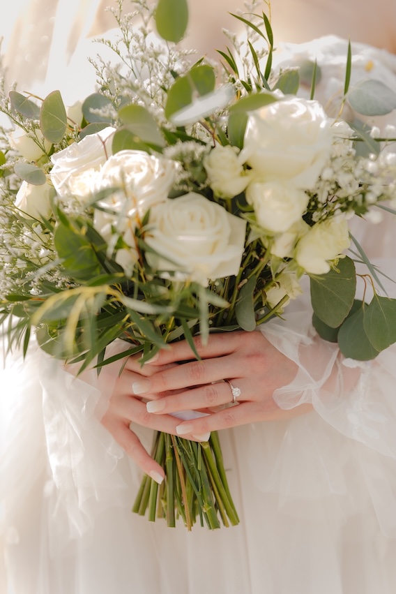 From the beginning, Courtney envisioned florals that were clean, soft, and natural. We leaned into a palette of white blooms paired with lush greenery, allowing texture and shape to create interest rather than bold color.
